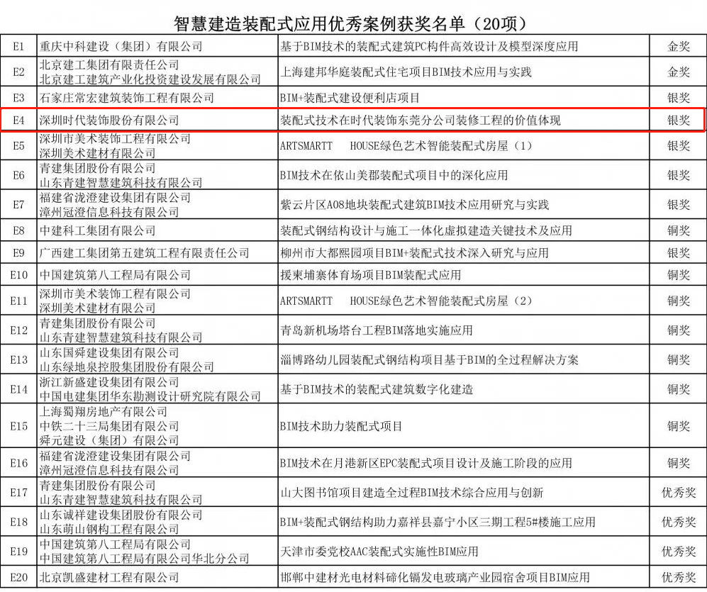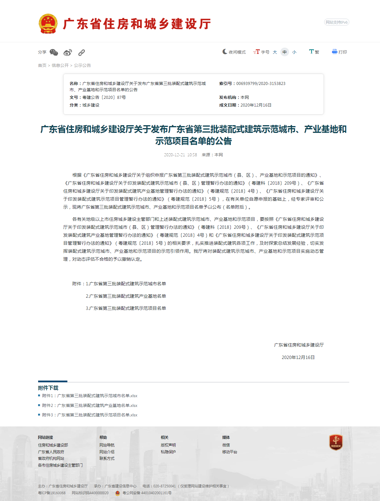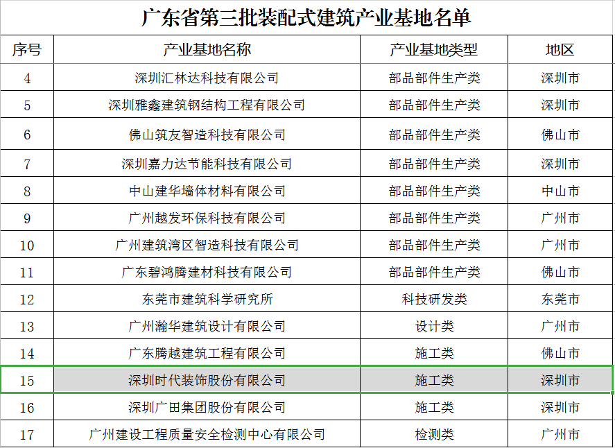 喜訊:2020年12月21日,廣東省住房和城鄉建設廳公布了廣東省第三批裝配式建筑示范城市、產業基地及示范項目的名單。深圳時代裝飾股份有限公司名列其中,被認定為“廣東省裝配式建筑產業基地”。