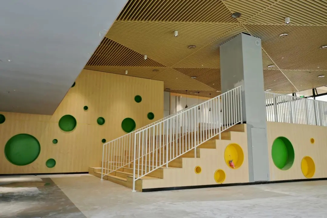 時代裝飾承建該項目的室內裝飾工程,始終把孩子們的健康與舒適放在首位,摒棄傳統膠粘、濕作業,積極采用干式工法,采用裝配式藝術吊頂、干掛吸音裝飾墻板及架空地板等工藝,從源頭降低室內空氣污染,并保證良好的吸音隔音效果,為孩子們創造了一個潔凈、安全、舒適、健康的成長環境。
