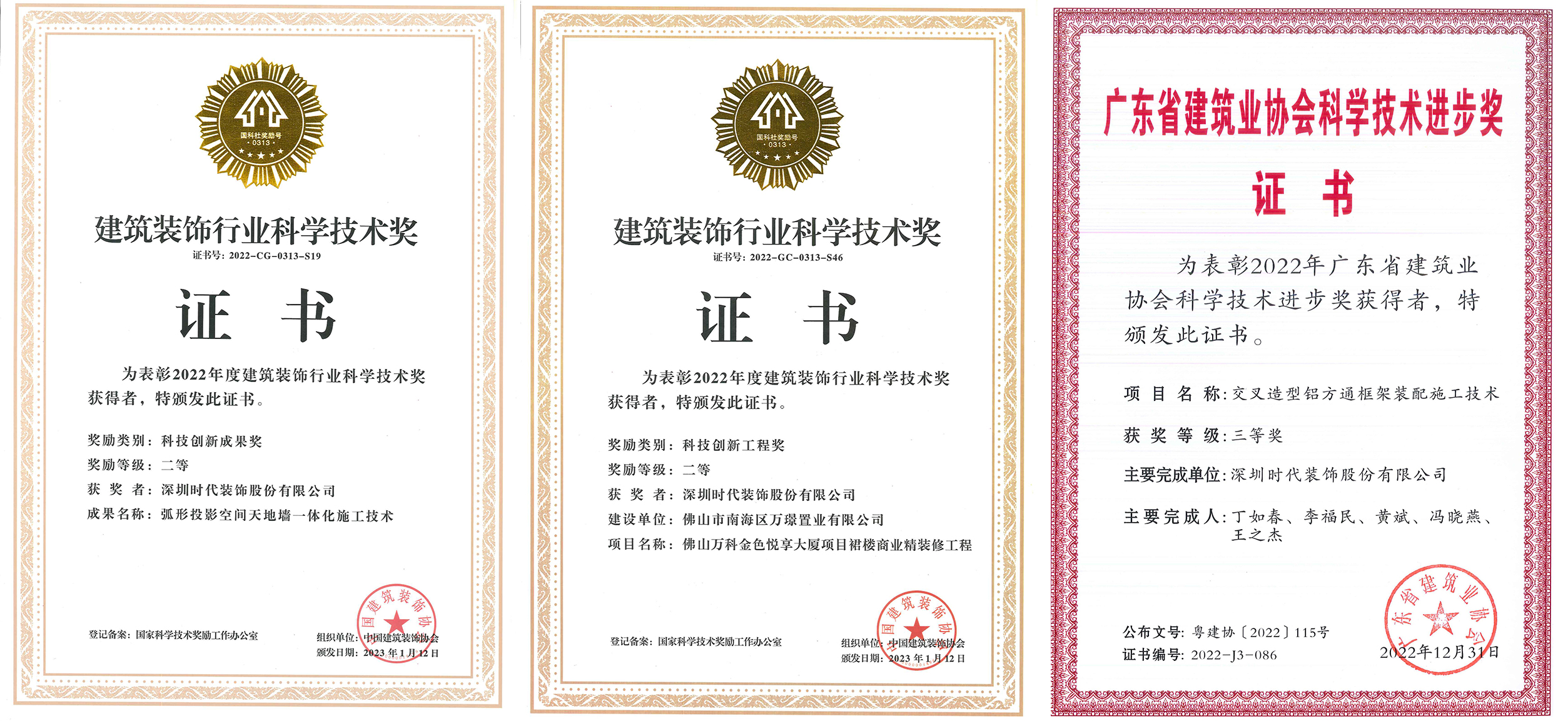 2022年,由我司承建的佛山萬科金色悅享大廈項目裙樓商業精裝修工程榮獲2022年度建筑裝飾行業科學技術獎——科技創新工程獎;由我司自主研發的弧形投影空間天地墻一體化施工技術、交叉造型鋁方通框架裝配施工技術分別獲得2022年度建筑裝飾行業科學技術獎——科技創新成果獎,2022年廣東省建筑業協會科學技術進步獎。