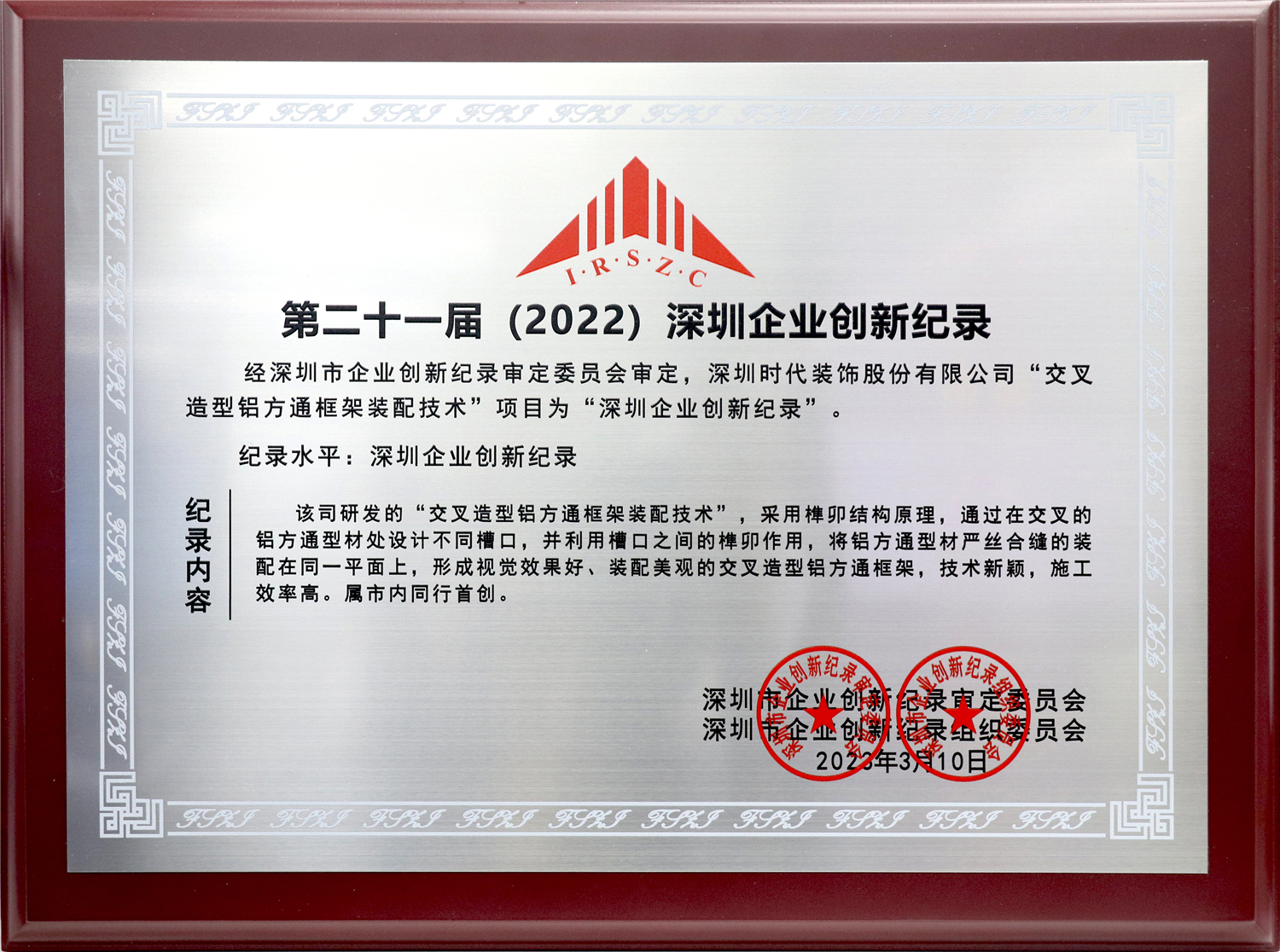 第二十一屆“深圳企業創新紀錄”審定會議成功召開,經深圳市企業創新紀錄審定委員會委員認真審議,最終審定通過151家企業的205個項目為第二十一屆“深圳企業創新紀錄”。其中,由我司自主研發的“交叉造型鋁方通框架裝配技術”成功獲評。目前該技術已在我司承建的華潤萬象食家等多個項目成功實施,屬于市內同行首創。